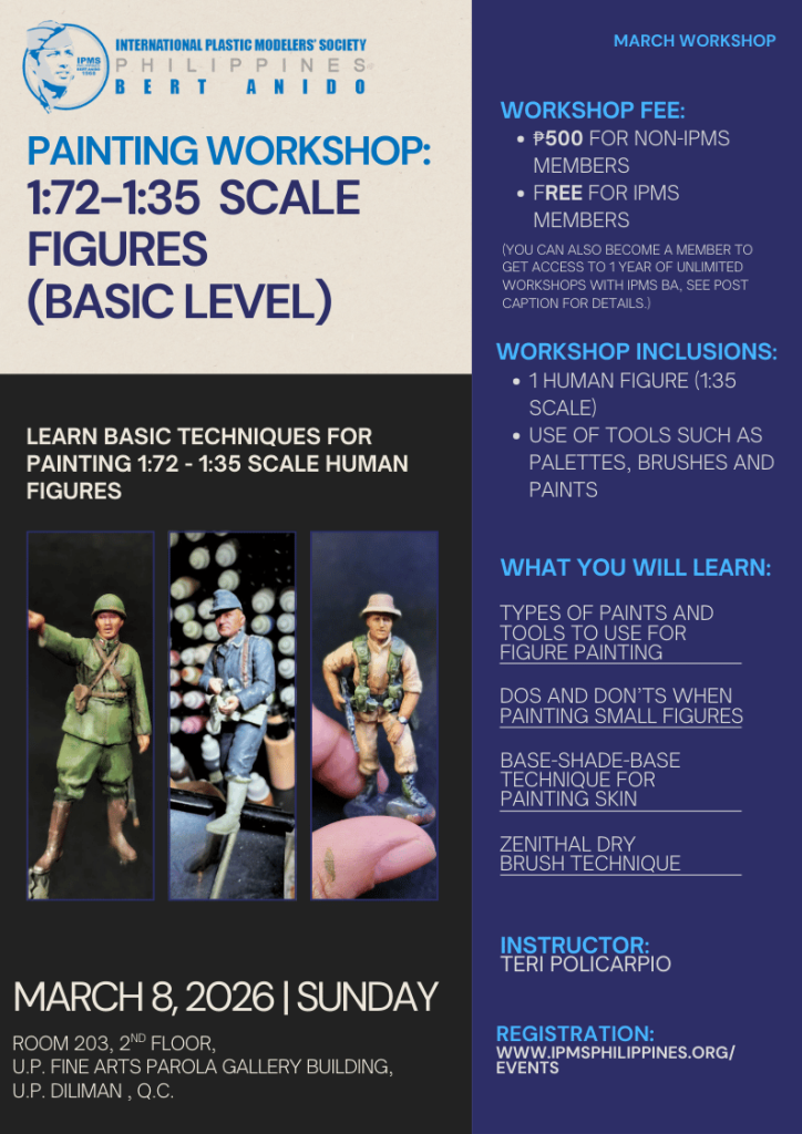 Posted inEvents IPMS BA PAINTING WORKSHOP: 1:72-35 FIGURES Posted by IPMS_PH March 3, 2026 REGISTER NOW IPMS_PH View All Posts Post navigation Previous Post IPMS BA BASIC HAND PAINTING WORKSHOP